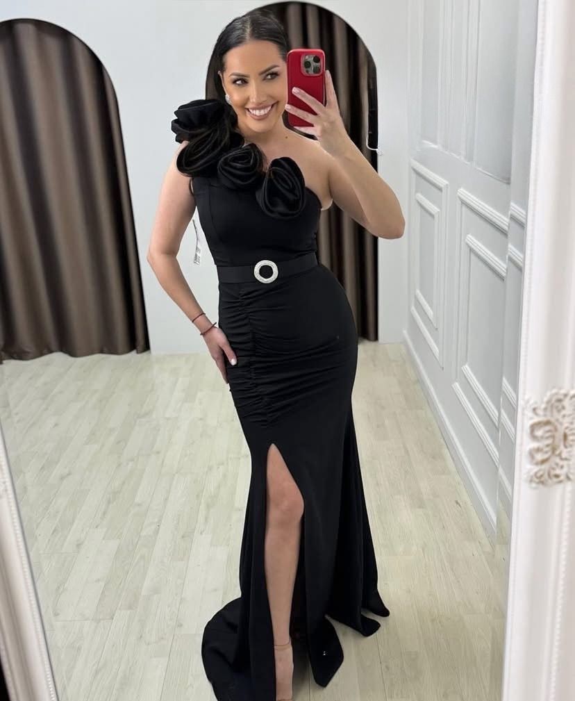 Impresionează la orice eveniment cu această rochie lungă neagră de seară, realizată din material elastic de calitate superioară, care evidențiază perfect formele feminine. Modelul asimetric, cu un umăr gol, este decorat cu aplicații florale tip trandafiri în zona bustului, adăugând o notă de rafinament și originalitate. Talia este accentuată de o curea elegantă cu cataramă metalică, iar despicătura adâncă pe picior oferă un aer senzual și sofisticat.