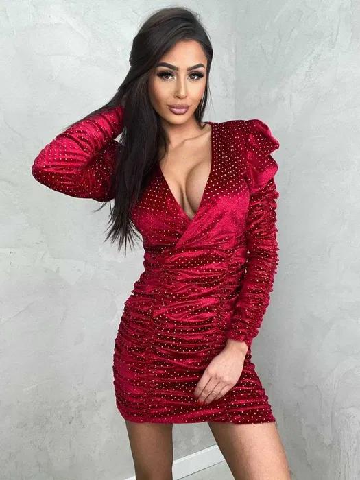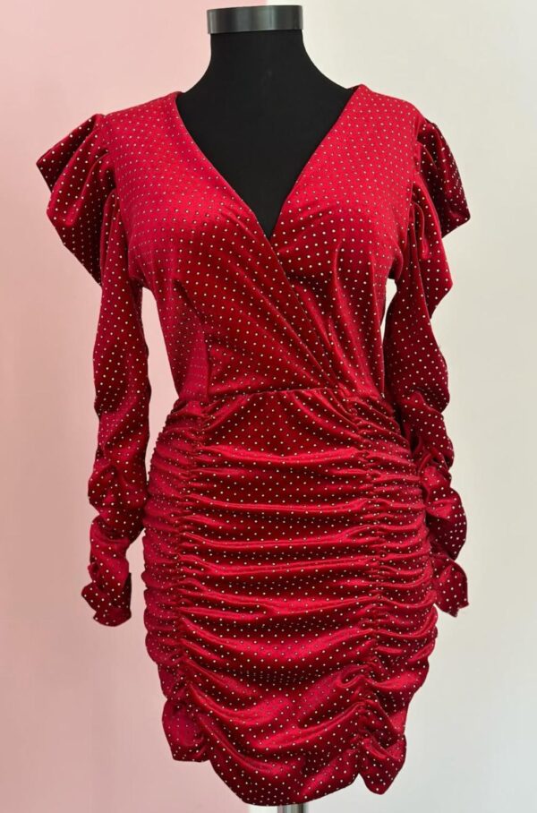 Această rochie scurtă din catifea se mulează delicat și are încrețituri la coapse pentru un efect feminin. Decorată cu mici bulinuțe, este perfectă pentru petreceri și evenimente elegante.